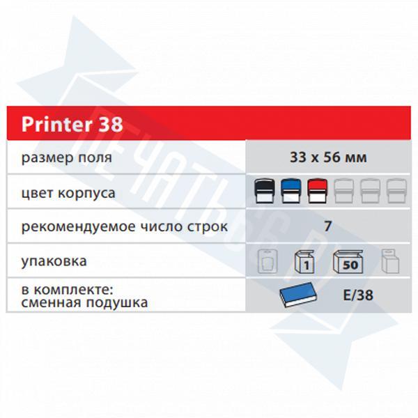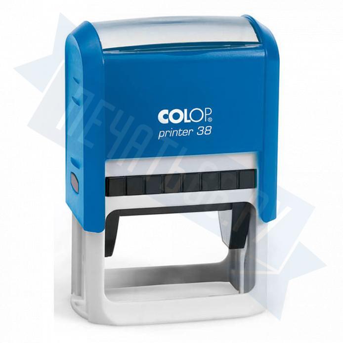 Оснастка Colop Printer 38 имеет: окно персонализации, клеевой слой для крепления клише печати. Штемпельная подушка: сменная, синяя, в комплекте.